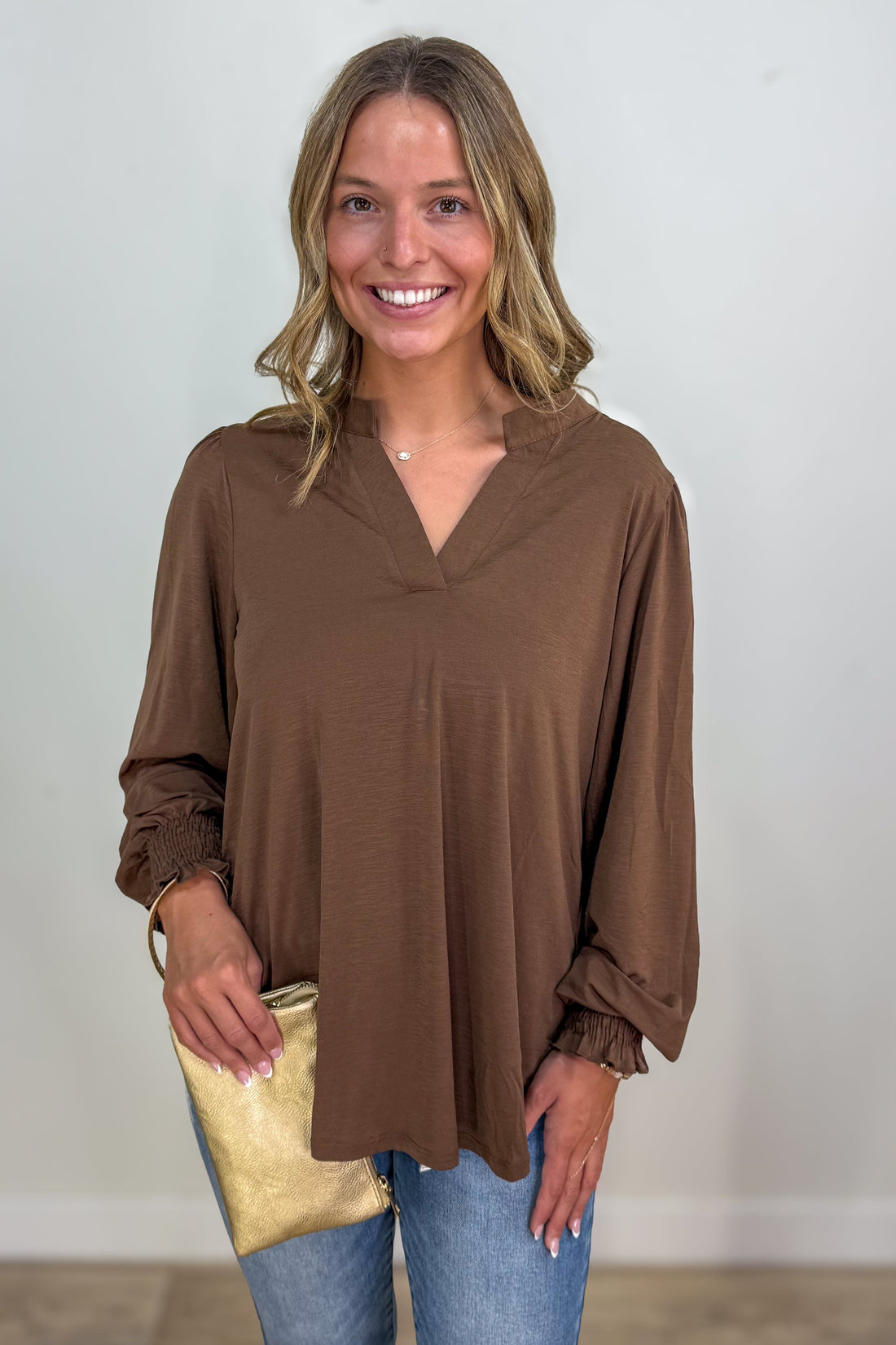 Mocha Solid Smocked Sleeve Lizzy Blouse