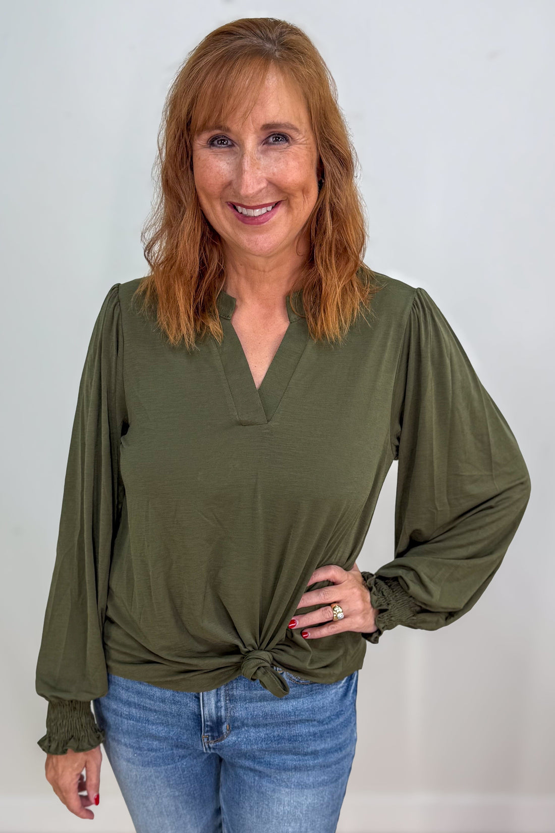 Olive Solid Smocked Sleeve Lizzy Blouse